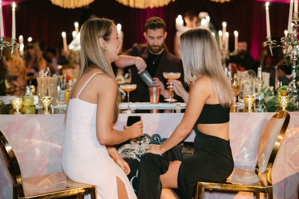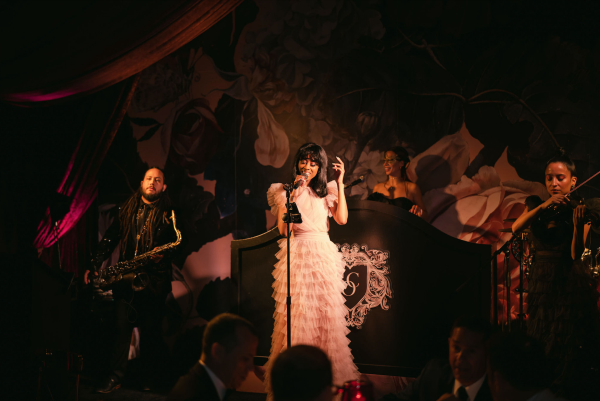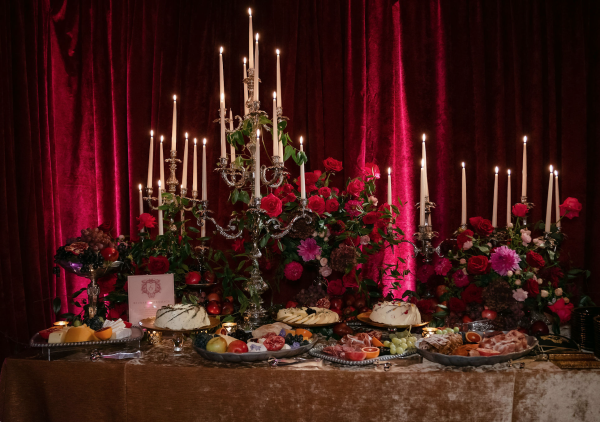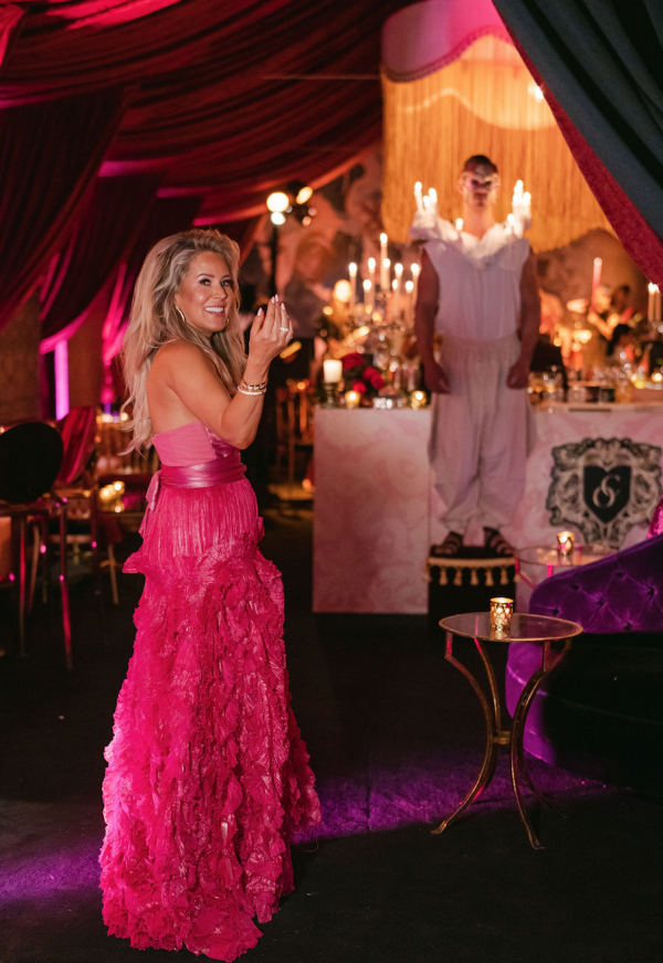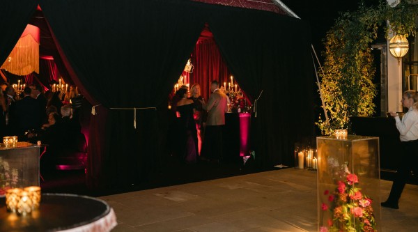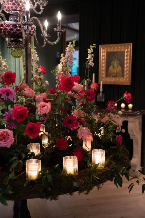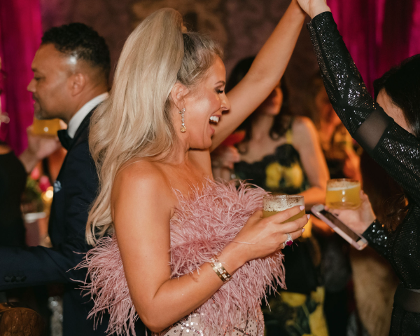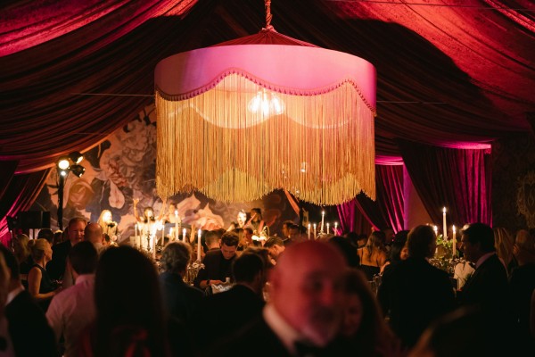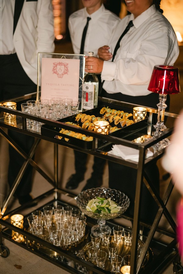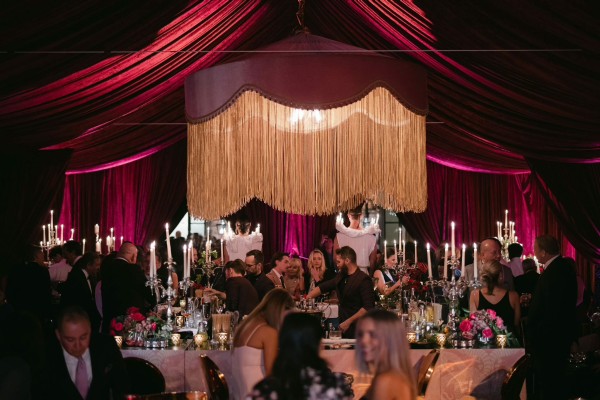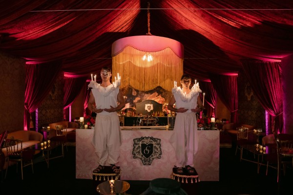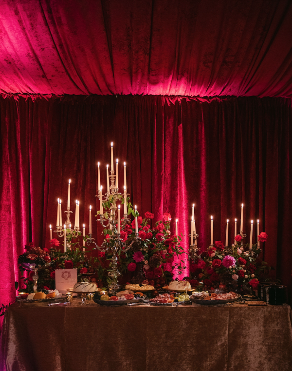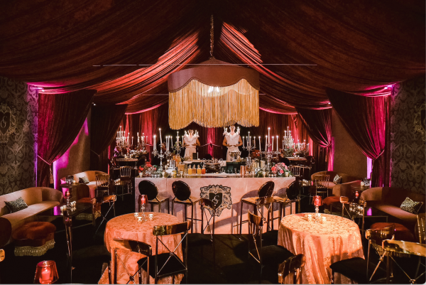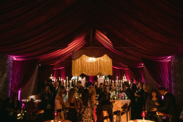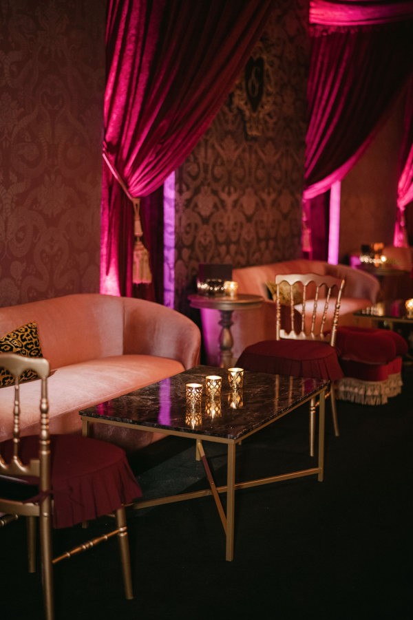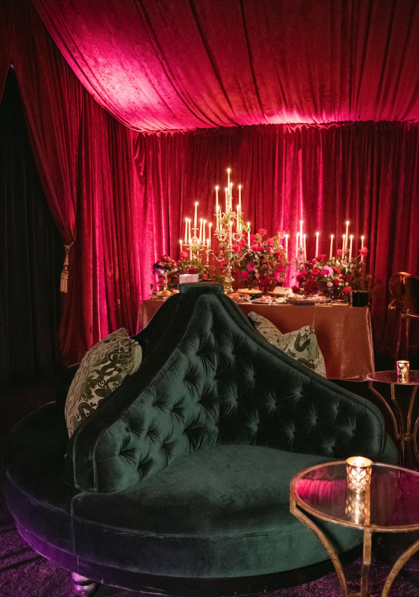 For the ultimate October house-warming party meets elopement celebration, we surprised guests after cocktail hour (which took place in the house and patio garden) by drawing back the curtains to reveal this sexy and sophisticated supper club style lounge tent. Inspired by the chic and exclusive members-only clubs you’d find in Mayfair, decor highlights included rich velvet curtains and jewel toned furnishings, human candelabras, boudoir style accents including a bespoke oversized Victorian velvet light fixture, gilded serpentine bar and serpentine lounge wallpaper panels and a large scale painted floral mural backdrop. The party revolved around the central large bar – which served up beautiful artisan cocktails that highlighted the couple’s tequila brand.