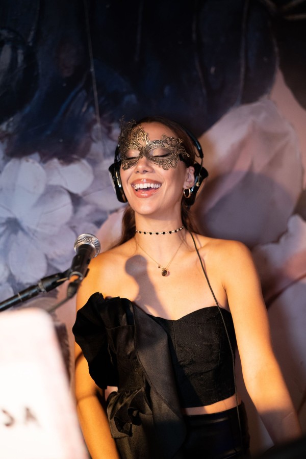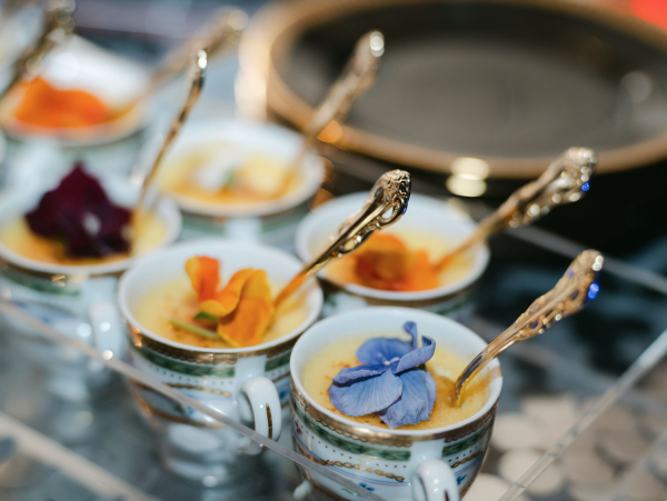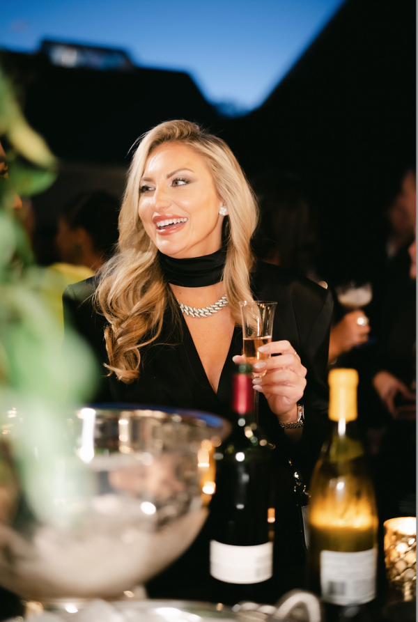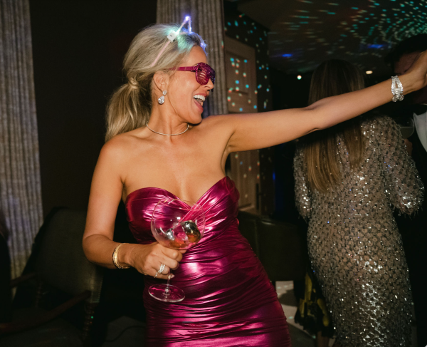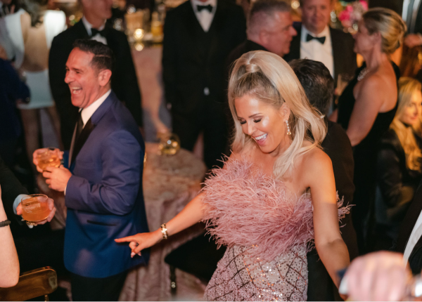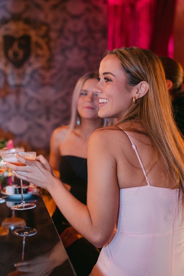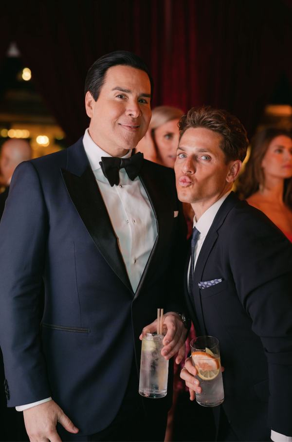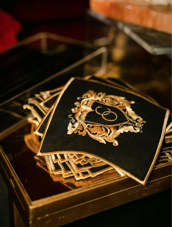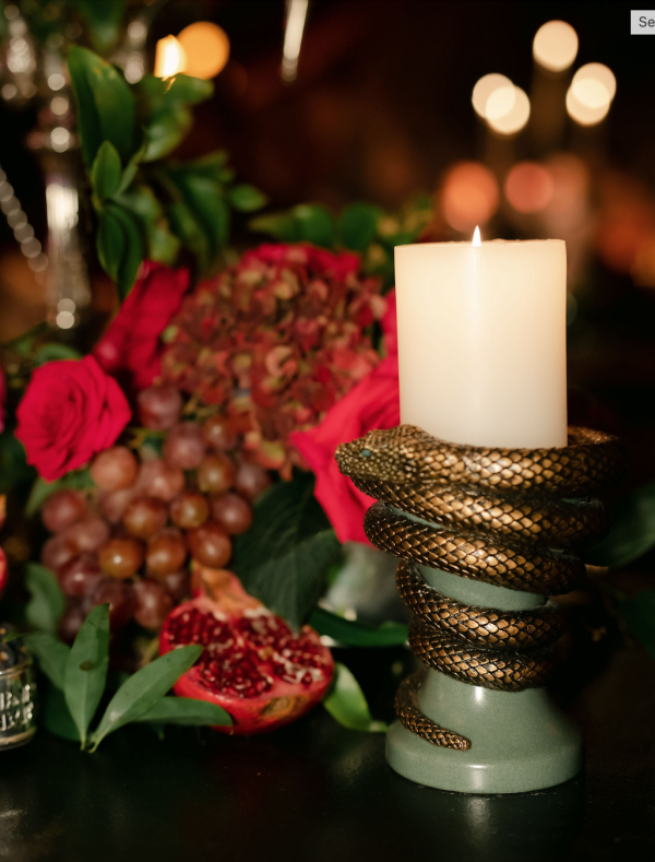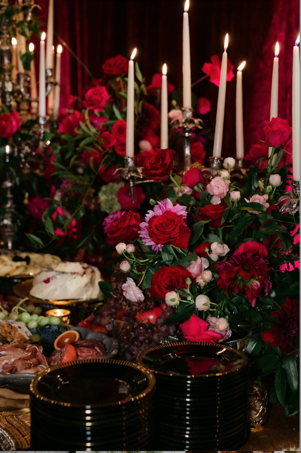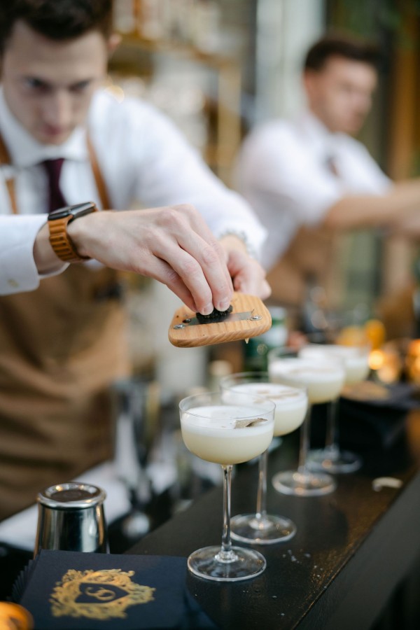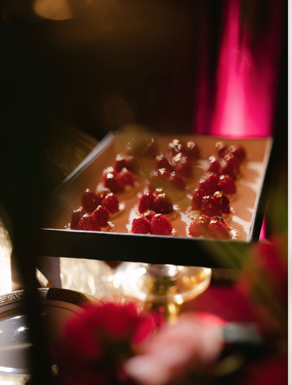 For the ultimate October house-warming party meets elopement celebration, we surprised guests after cocktail hour (which took place in the house and patio garden) by drawing back the curtains to reveal this sexy and sophisticated supper club style lounge tent. Inspired by the chic and exclusive members-only clubs you’d find in Mayfair, decor highlights included rich velvet curtains and jewel toned furnishings, human candelabras, boudoir style accents including a bespoke oversized Victorian velvet light fixture, gilded serpentine bar and serpentine lounge wallpaper panels and a large scale painted floral mural backdrop. The party revolved around the central large bar – which served up beautiful artisan cocktails that highlighted the couple’s tequila brand.
