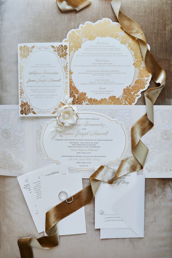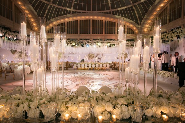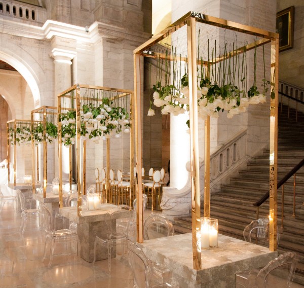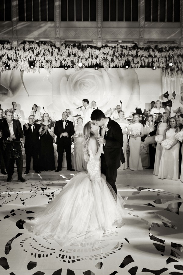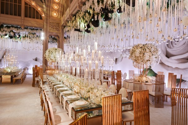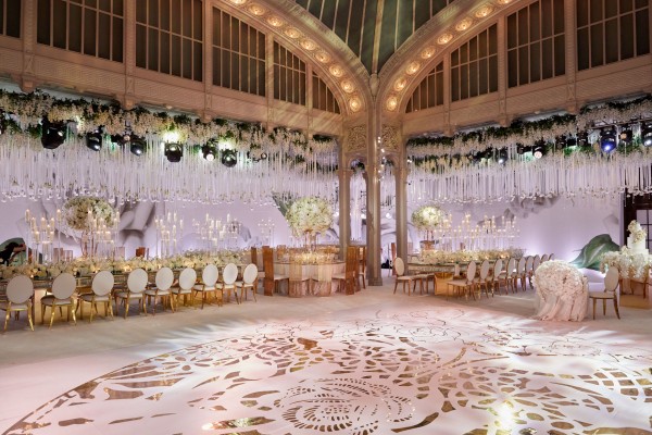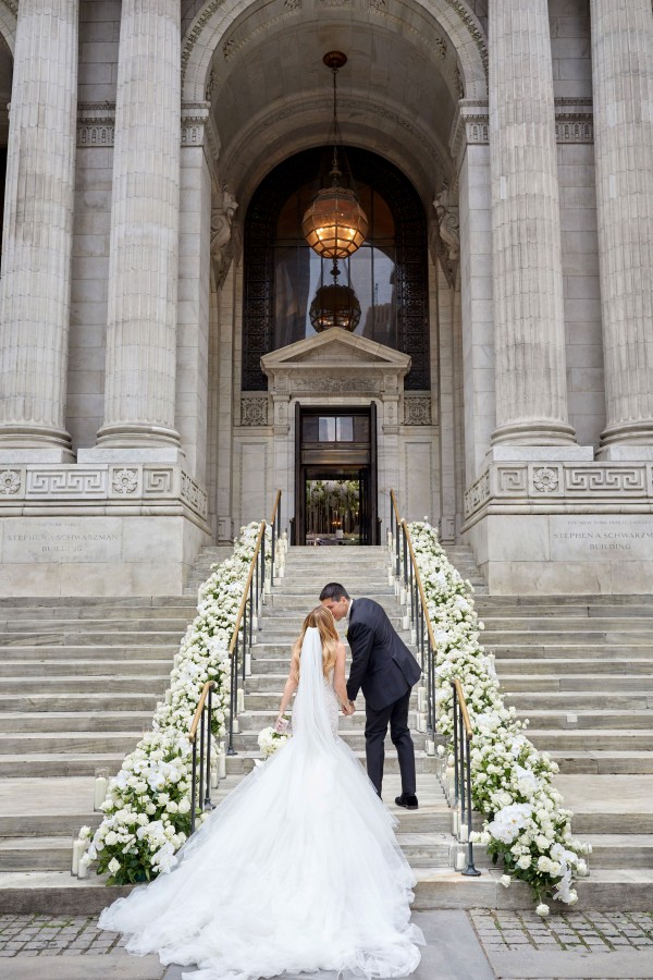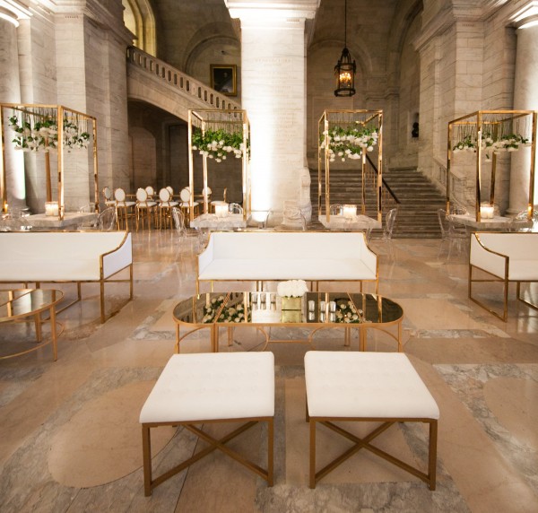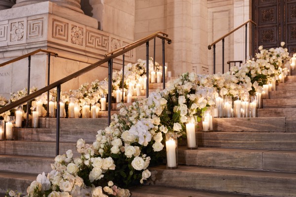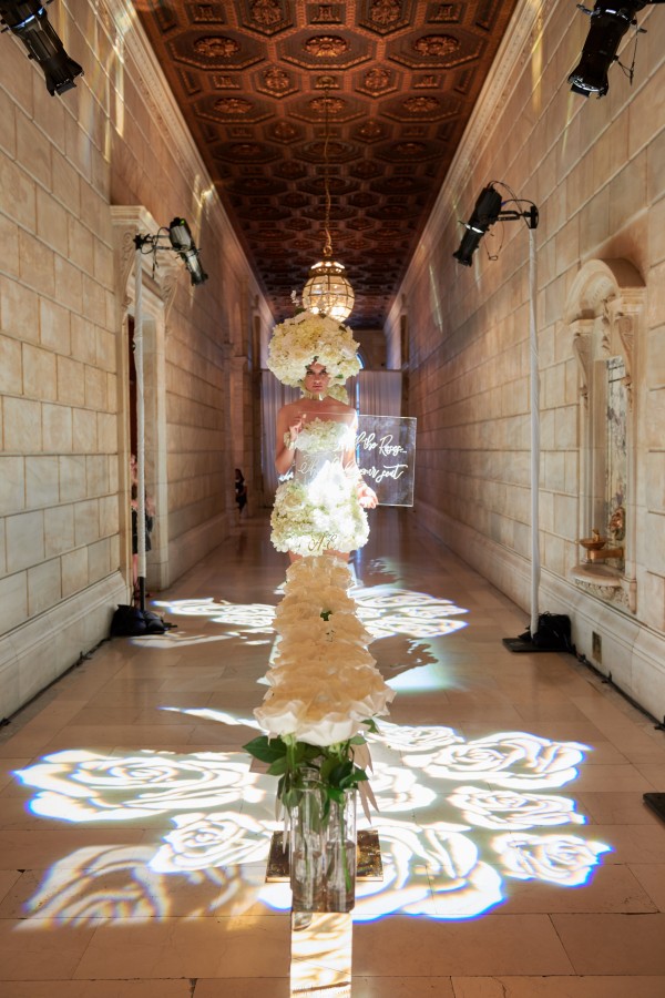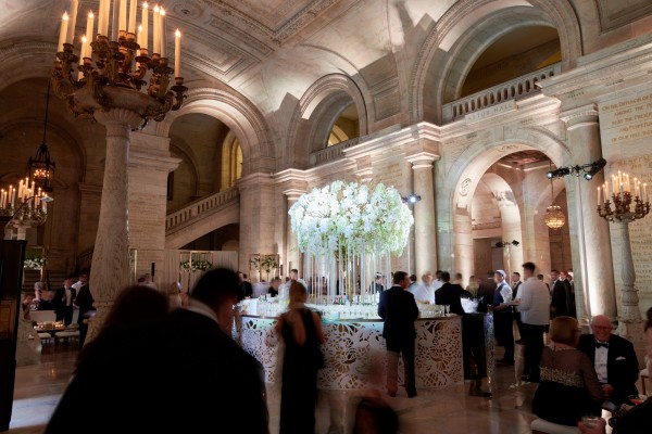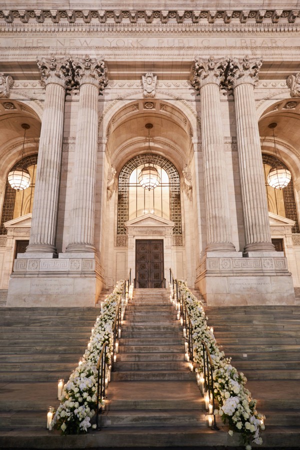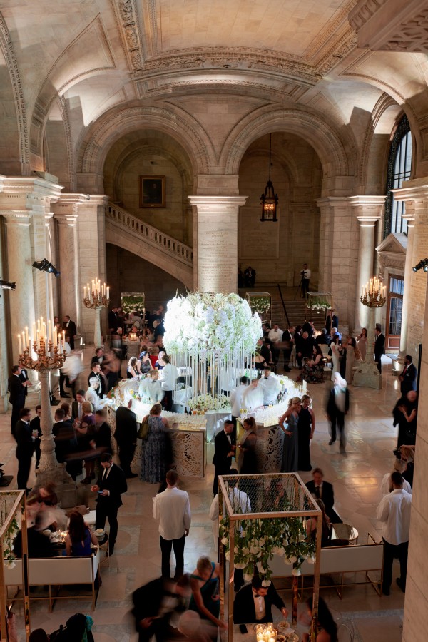 A stunning summer white wedding at St. Patrick’s Cathedral + The New York Public Library. A gold mirrored cocktail hour bar was wrapped in a laser cut lace pattern that coordinated with their Ceci New York invitation pattern. Cocktail tables were draped with white roses hanging from golden structures, and our sequin-clad musician welcomed guests with her glowing, lucite electric violin. A long hallway of roses helped guests find their seat with assistance from our costumed “rosebud” ladies. Guests then made their way to the reception where they laid their rose in a candlelit memorial pond we created just outside the reception entrance in honor of the groom’s late parents. For dinner, we transformed the Bartos Forum at NYPL into an ethereal environment, wrapping the room in giant floral walls, white carpet, a gold mirror and laser cut dance floor centered under the iconic dome, and the entire perimeter ceiling covered in hanging flowers, ribbons and crystals. Thousands of candles and lots of layered white texture contributed to the heavenly ambiance. Guests danced the night away to the vibrant Marianne Bennett Orchestra. At 1am, guests made their way to the afterparty across the street to The Andaz where a speakeasy vibe and overstuffed leather couches awaited them at “The Bar Downstairs.” Our DJ spun house music and Shake Shack was brought in to fuel late night dancing.