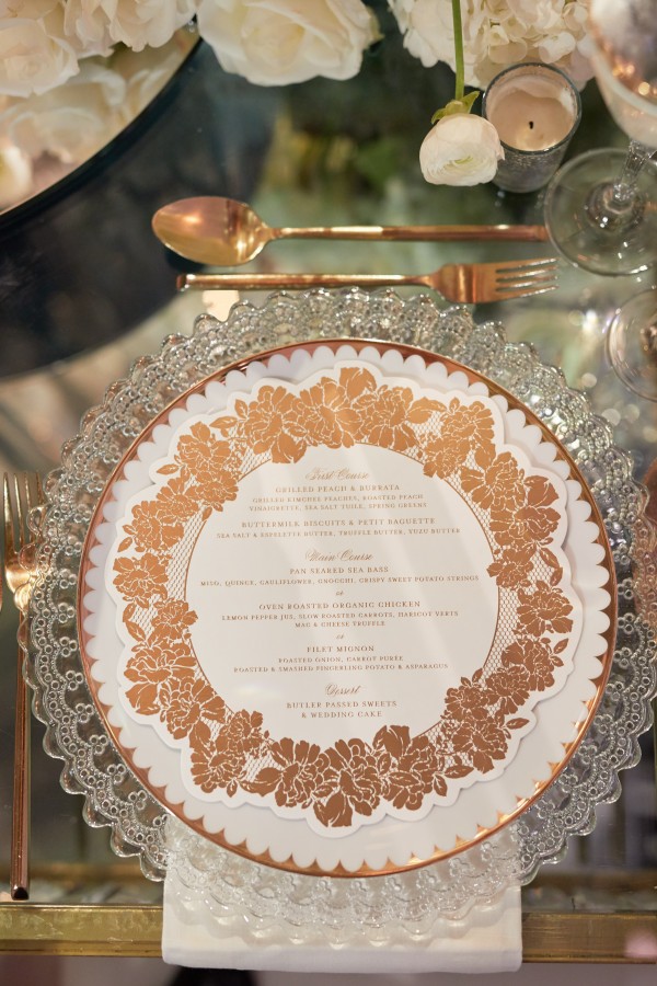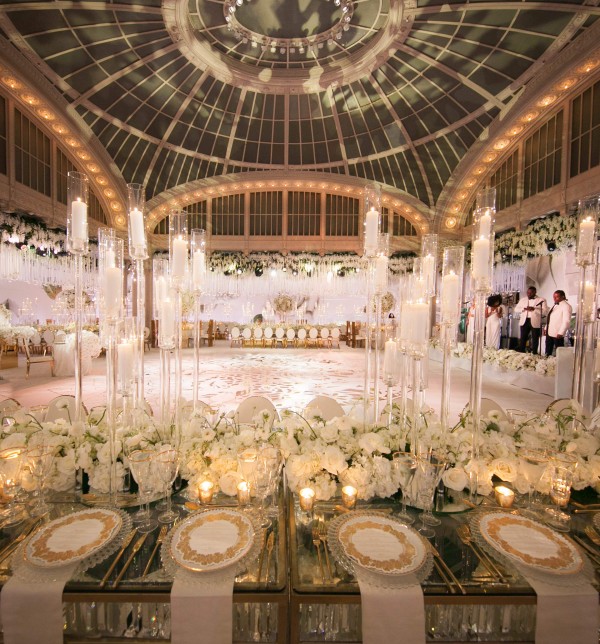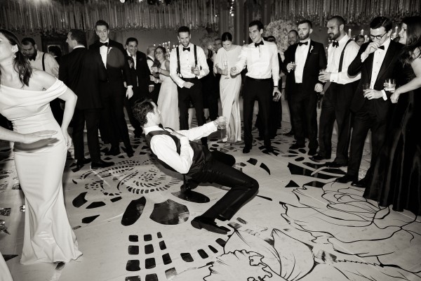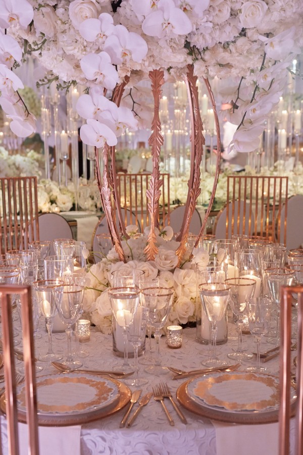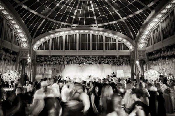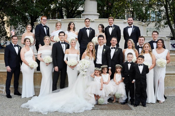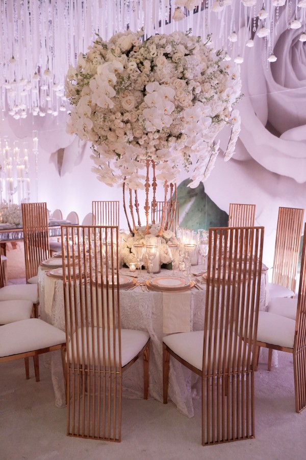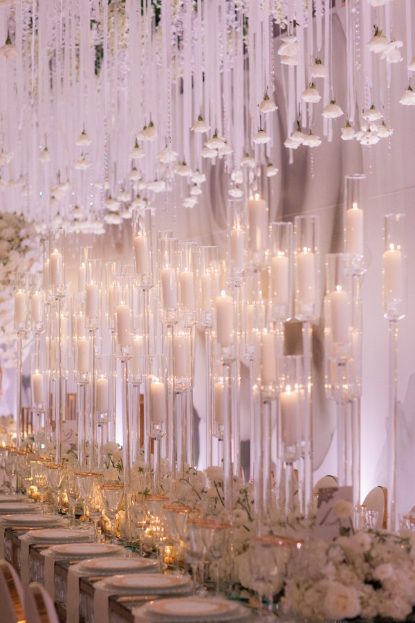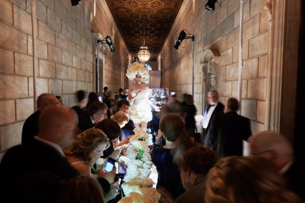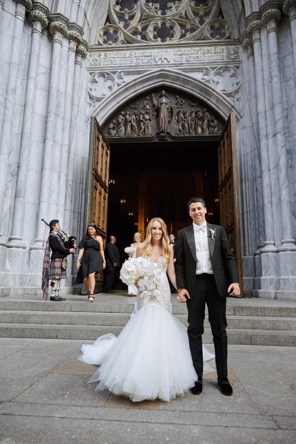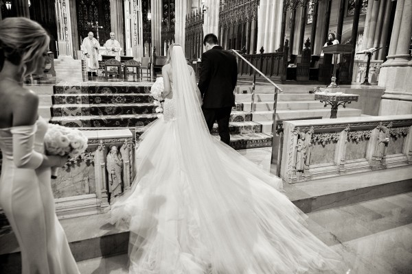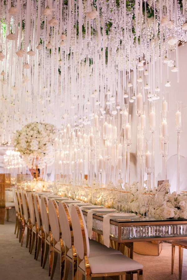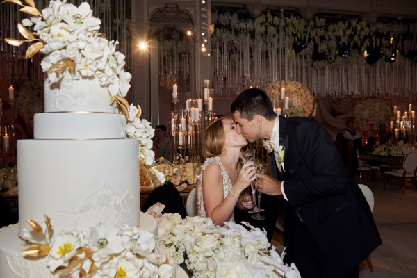 A stunning summer white wedding at St. Patrick’s Cathedral + The New York Public Library. A gold mirrored cocktail hour bar was wrapped in a laser cut lace pattern that coordinated with their Ceci New York invitation pattern. Cocktail tables were draped with white roses hanging from golden structures, and our sequin-clad musician welcomed guests with her glowing, lucite electric violin. A long hallway of roses helped guests find their seat with assistance from our costumed “rosebud” ladies. Guests then made their way to the reception where they laid their rose in a candlelit memorial pond we created just outside the reception entrance in honor of the groom’s late parents. For dinner, we transformed the Bartos Forum at NYPL into an ethereal environment, wrapping the room in giant floral walls, white carpet, a gold mirror and laser cut dance floor centered under the iconic dome, and the entire perimeter ceiling covered in hanging flowers, ribbons and crystals. Thousands of candles and lots of layered white texture contributed to the heavenly ambiance. Guests danced the night away to the vibrant Marianne Bennett Orchestra. At 1am, guests made their way to the afterparty across the street to The Andaz where a speakeasy vibe and overstuffed leather couches awaited them at “The Bar Downstairs.” Our DJ spun house music and Shake Shack was brought in to fuel late night dancing.