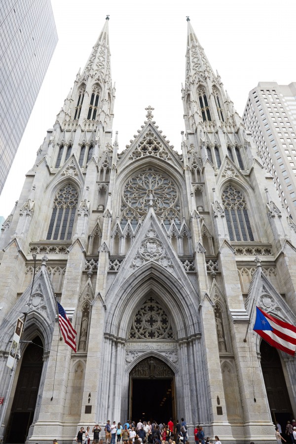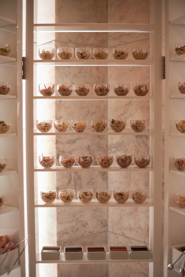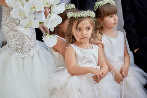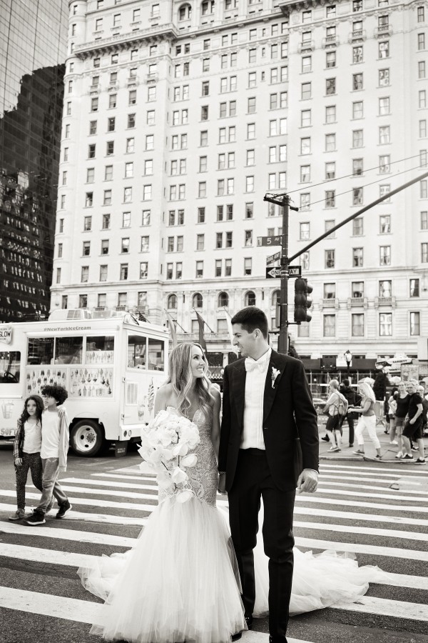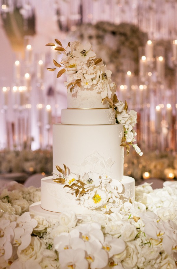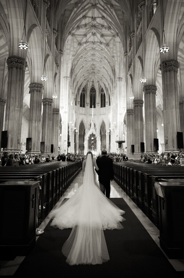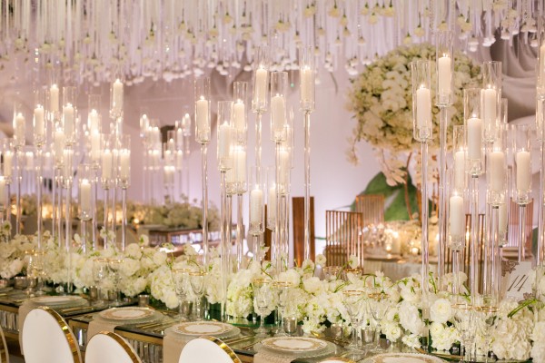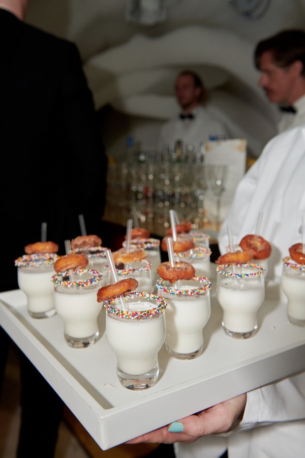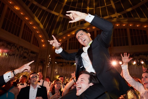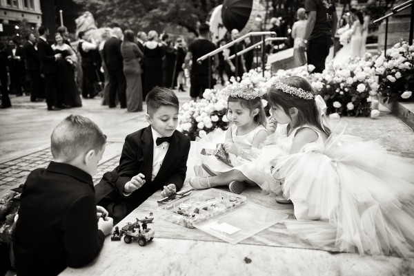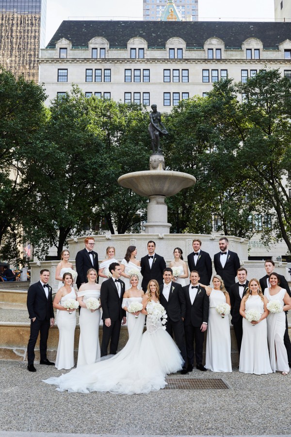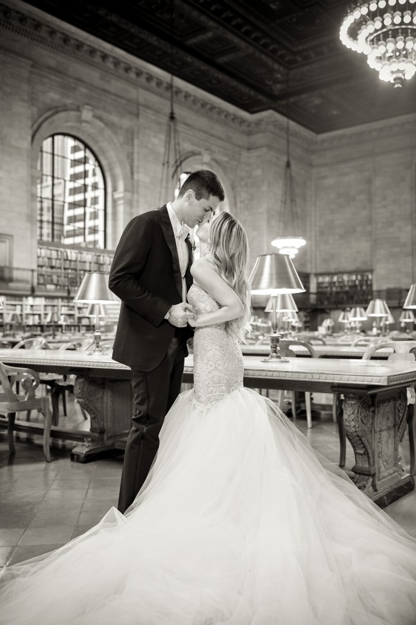 A stunning summer white wedding at St. Patrick’s Cathedral + The New York Public Library. A gold mirrored cocktail hour bar was wrapped in a laser cut lace pattern that coordinated with their Ceci New York invitation pattern. Cocktail tables were draped with white roses hanging from golden structures, and our sequin-clad musician welcomed guests with her glowing, lucite electric violin. A long hallway of roses helped guests find their seat with assistance from our costumed “rosebud” ladies. Guests then made their way to the reception where they laid their rose in a candlelit memorial pond we created just outside the reception entrance in honor of the groom’s late parents. For dinner, we transformed the Bartos Forum at NYPL into an ethereal environment, wrapping the room in giant floral walls, white carpet, a gold mirror and laser cut dance floor centered under the iconic dome, and the entire perimeter ceiling covered in hanging flowers, ribbons and crystals. Thousands of candles and lots of layered white texture contributed to the heavenly ambiance. Guests danced the night away to the vibrant Marianne Bennett Orchestra. At 1am, guests made their way to the afterparty across the street to The Andaz where a speakeasy vibe and overstuffed leather couches awaited them at “The Bar Downstairs.” Our DJ spun house music and Shake Shack was brought in to fuel late night dancing.