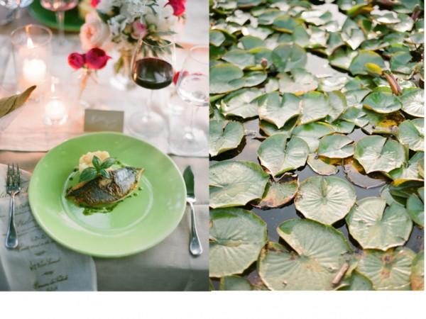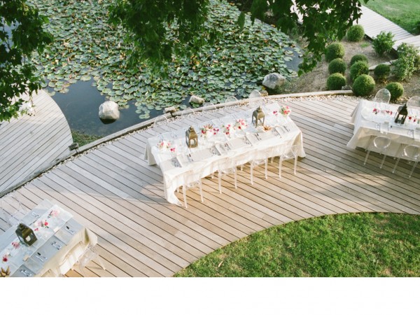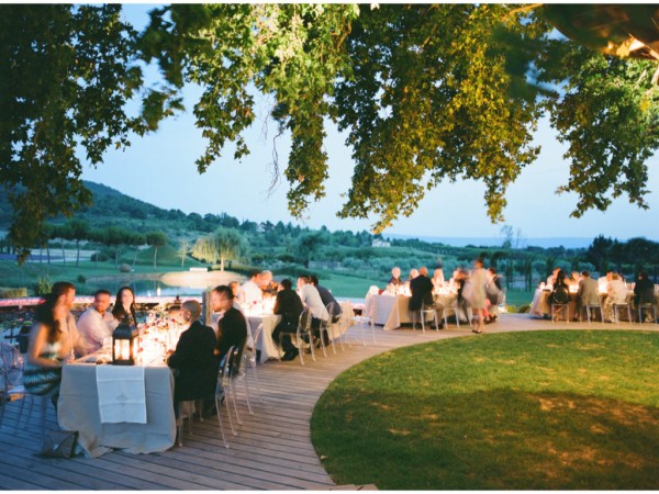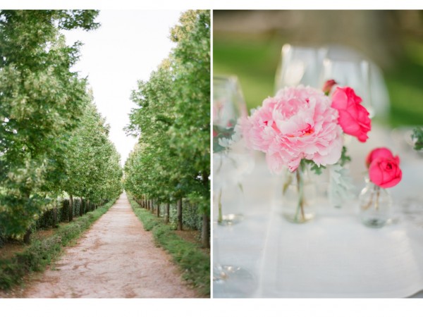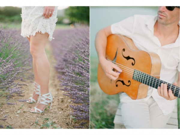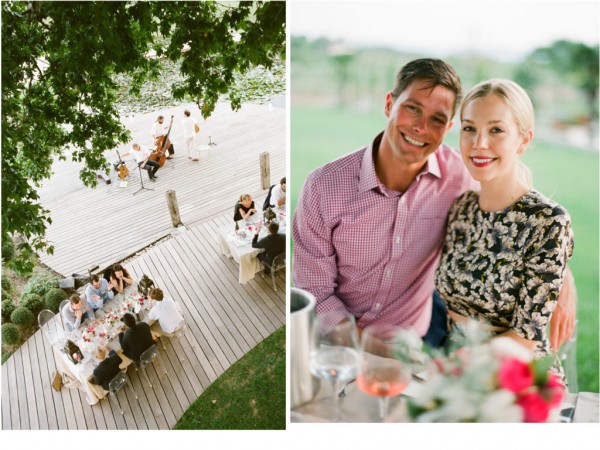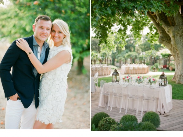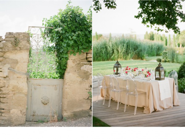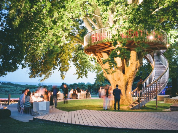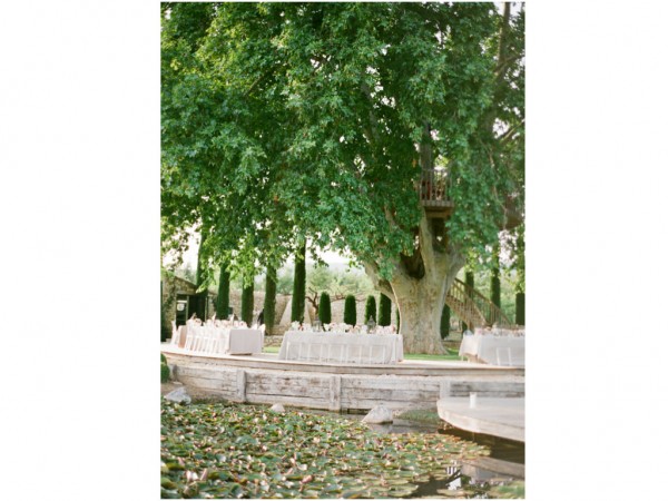 A chic rehearsal dinner under a majestic Plantane Tree in Saint-Saturnin-lès-Apt, Provence. The venue, comprised of historic stone farm buildings and cottages overlooking acres of lavender fields and olive groves, has played host to events for high-end fashion houses such as Jean-Paul Gaultier. Renowned chef Alain Ducasse presides over the property. The party started off with a cocktail hour in “le potager” – the organic vegetable garden, with a French gyspy jazz trio while guests sipped on their signature French 75 martini and enjoyed hors d’oeuvres, many ingredients of which were sourced straight from the garden itself. When it was time for guests to make their way to dinner, the musicians led the way while continuing the serenade. Dinner was served al fresco on the circular deck which wrapped around the tree, surrounded by a lily pad-laden pond and views of the gorgeous lavender fields, apricot tree orchards and olive groves. After dinner, guests were beckoned to the treetop where dessert was served – a fun surprise!