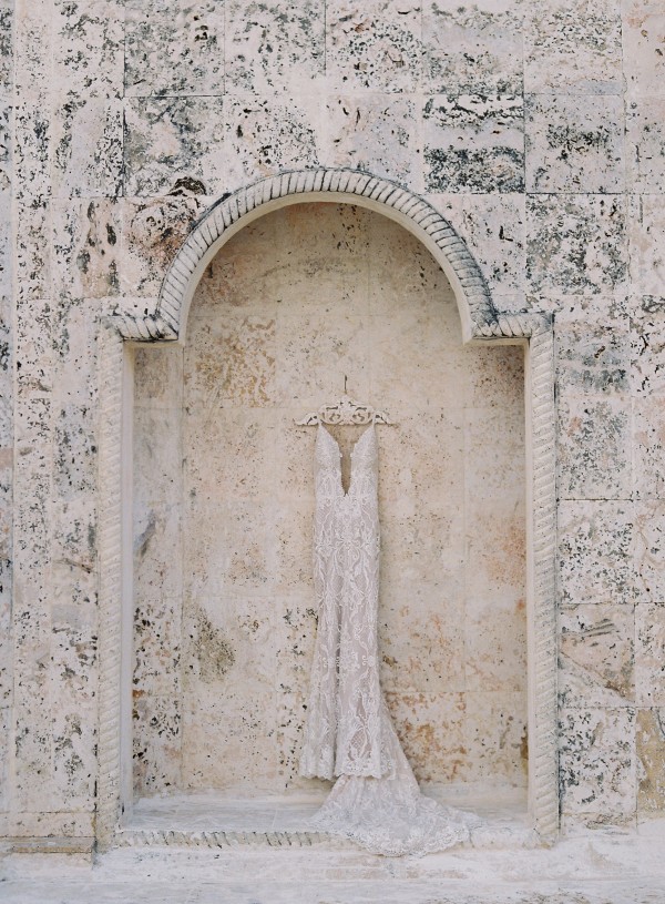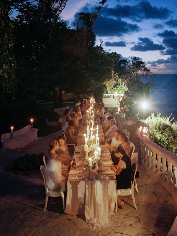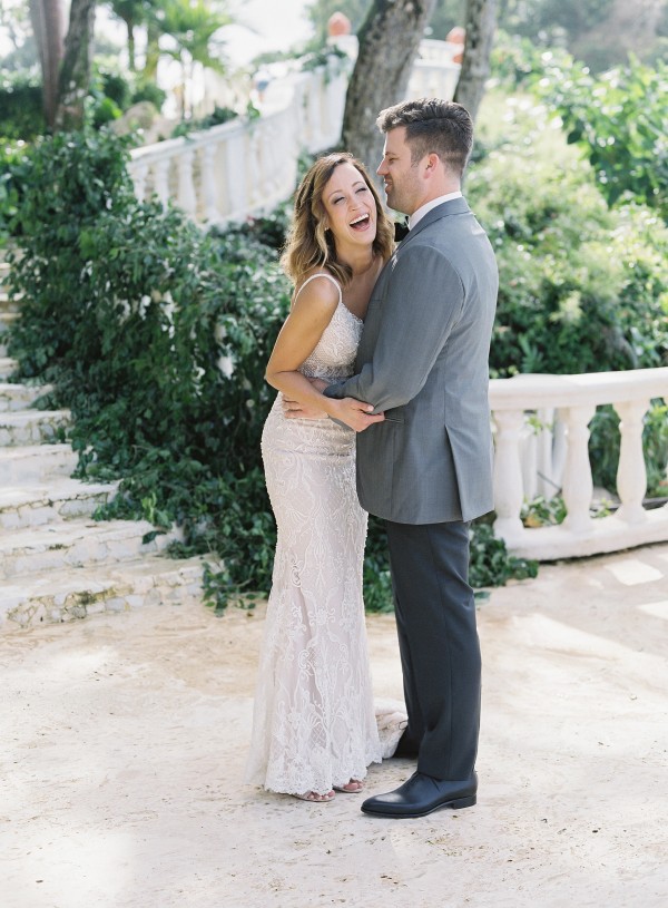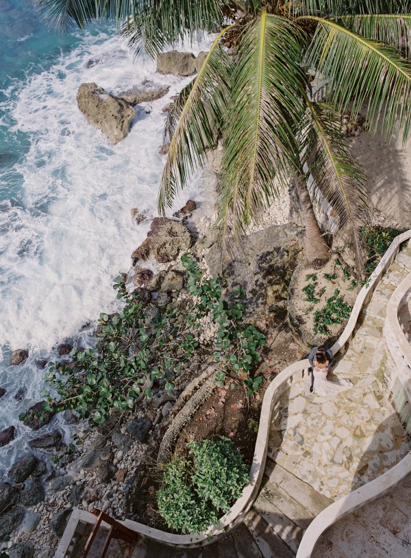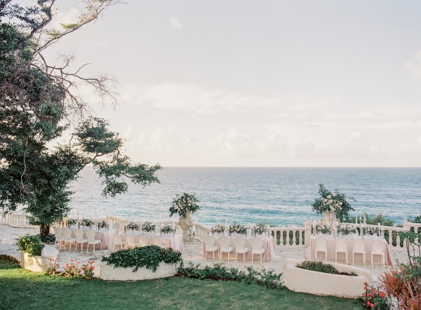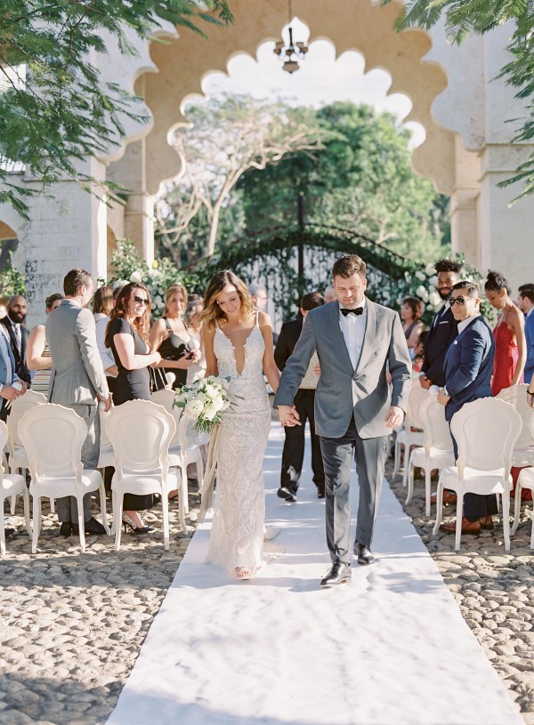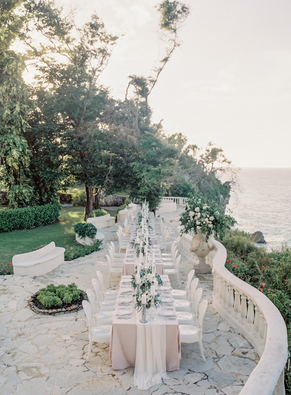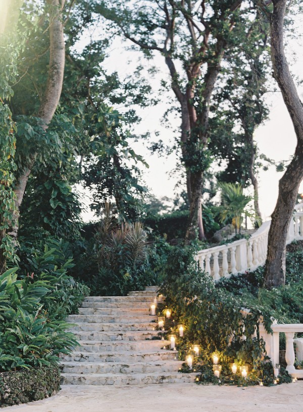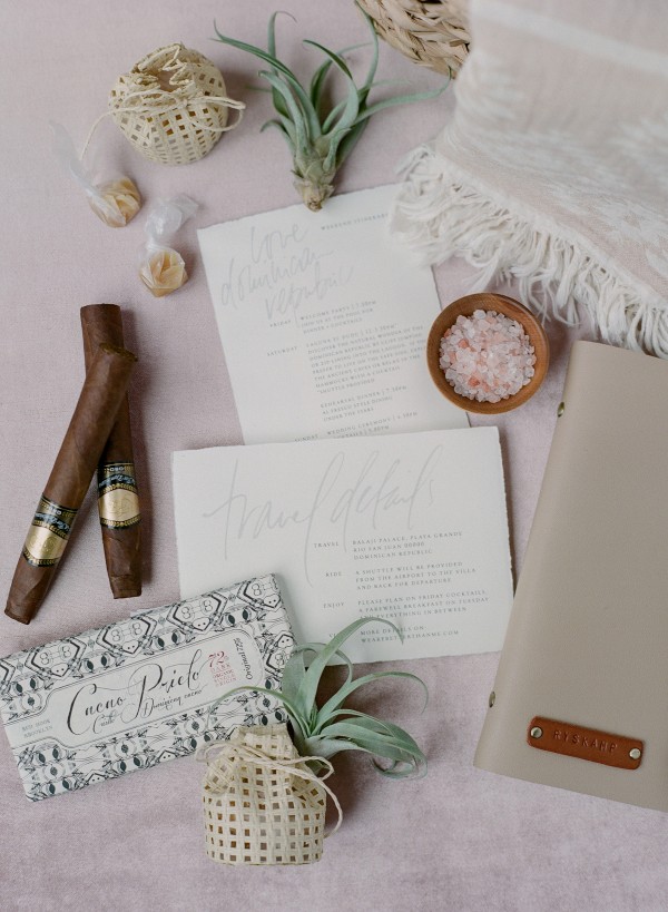 A destination wedding weekend in a picturesque, romantic seaside villa on the jungle side of the Dominican Republic, perched high on rugged cliffs.  A place where roaming peacocks and chirping exotic birds in the tallest of palm trees set the stage for the big day.  The old world architecture framed the ceremony perfectly, which took place in front of the gate house.  Jess was a vision as she was escorted down the aisle by her son Ben – an emotional moment for all. Guests joyfully celebrated the newlyweds (and new formed family) with maracas saying BESO! (kiss!).  At cocktail hour, guests sipped signature mojitos while taking in the exotic, stunning views.  They then ascended up a magical staircase of overgrown greenery and hurricane candles where an impressive rose gold sunset awaited – welcoming guests to the long candlelit dinner tables. The perfectly pale palette allowed the scenery to steal the show while ocean waves dramatically crashed against the cliffs below.  Dinner concluded with a surprise firework display during cake cutting…and guests were then led to another area for dancing the night away and a thrilling fire dance show.