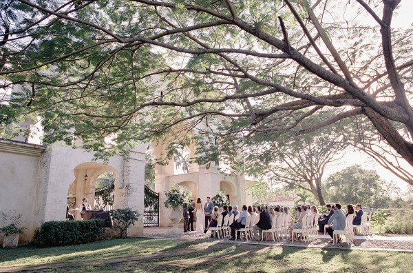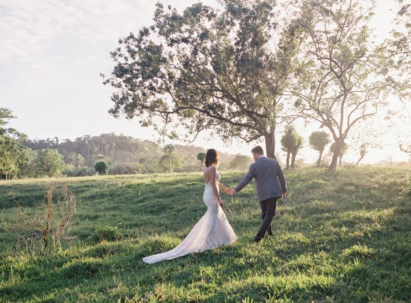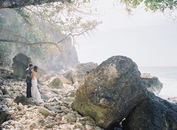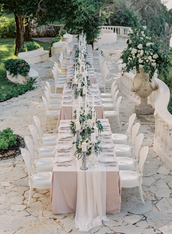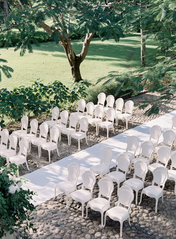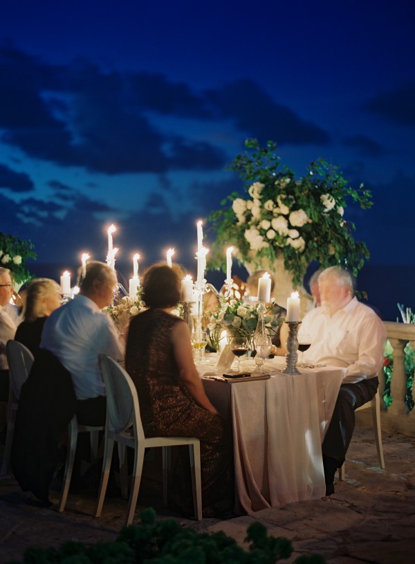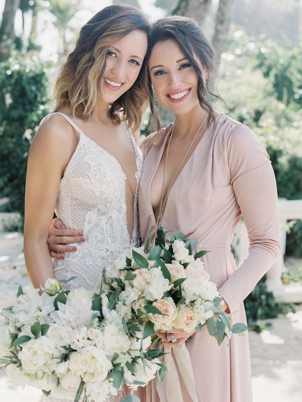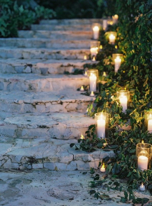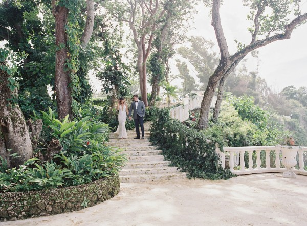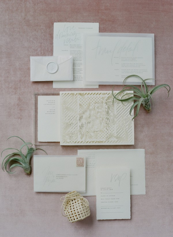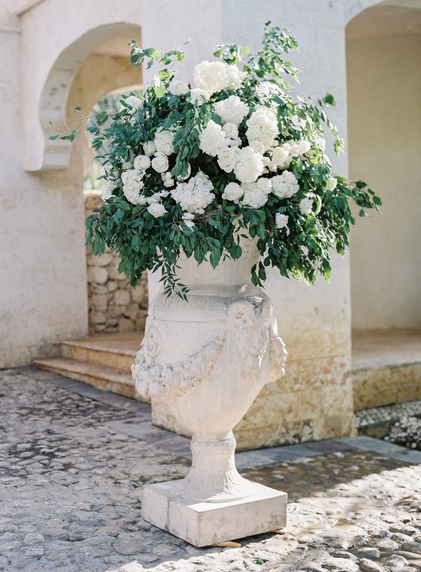 A destination wedding weekend in a picturesque, romantic seaside villa on the jungle side of the Dominican Republic, perched high on rugged cliffs.  A place where roaming peacocks and chirping exotic birds in the tallest of palm trees set the stage for the big day.  The old world architecture framed the ceremony perfectly, which took place in front of the gate house.  Jess was a vision as she was escorted down the aisle by her son Ben – an emotional moment for all. Guests joyfully celebrated the newlyweds (and new formed family) with maracas saying BESO! (kiss!).  At cocktail hour, guests sipped signature mojitos while taking in the exotic, stunning views.  They then ascended up a magical staircase of overgrown greenery and hurricane candles where an impressive rose gold sunset awaited – welcoming guests to the long candlelit dinner tables. The perfectly pale palette allowed the scenery to steal the show while ocean waves dramatically crashed against the cliffs below.  Dinner concluded with a surprise firework display during cake cutting…and guests were then led to another area for dancing the night away and a thrilling fire dance show.