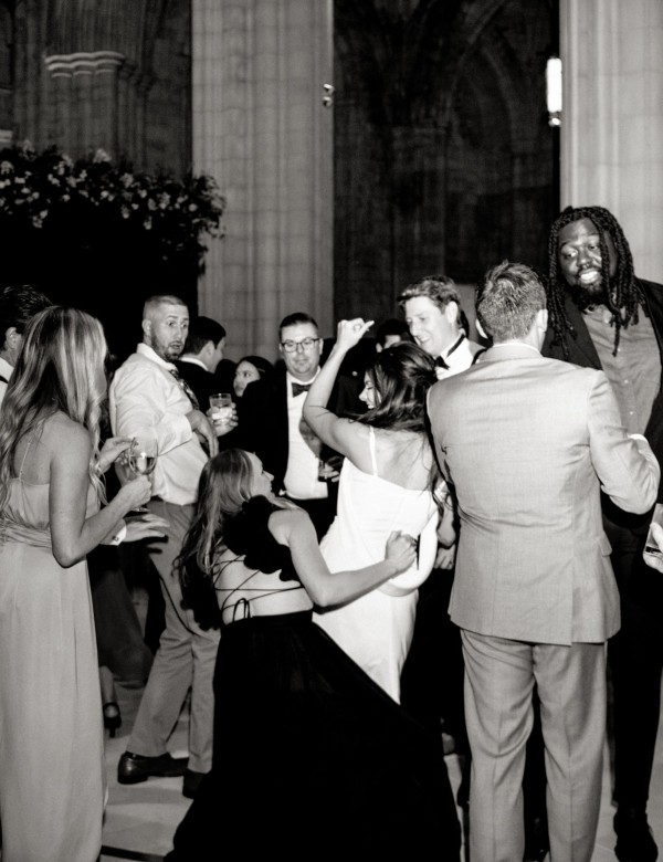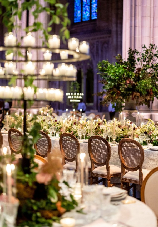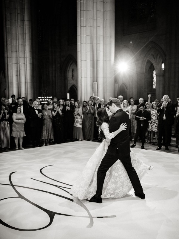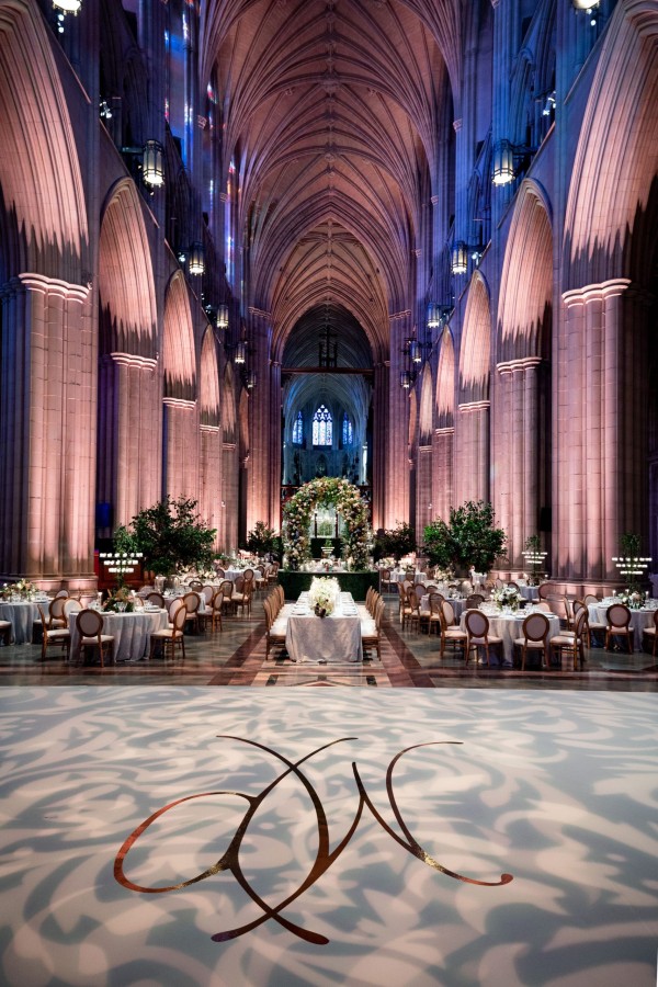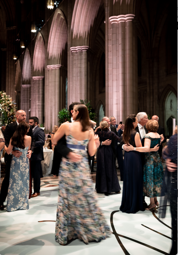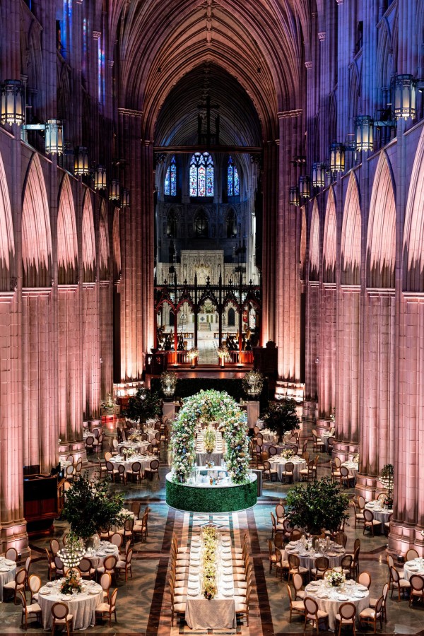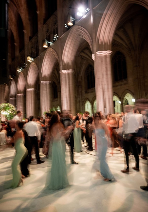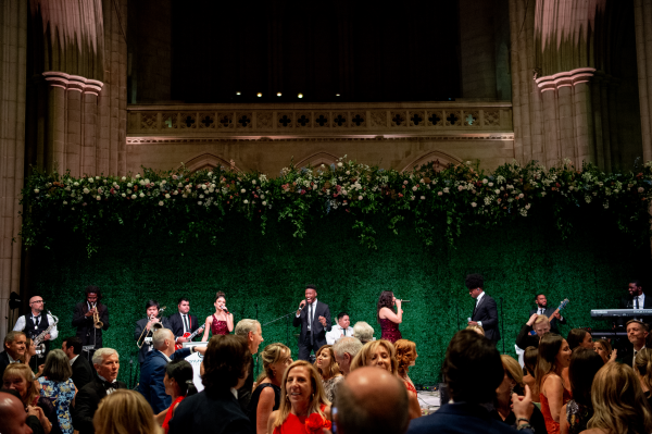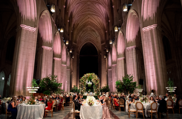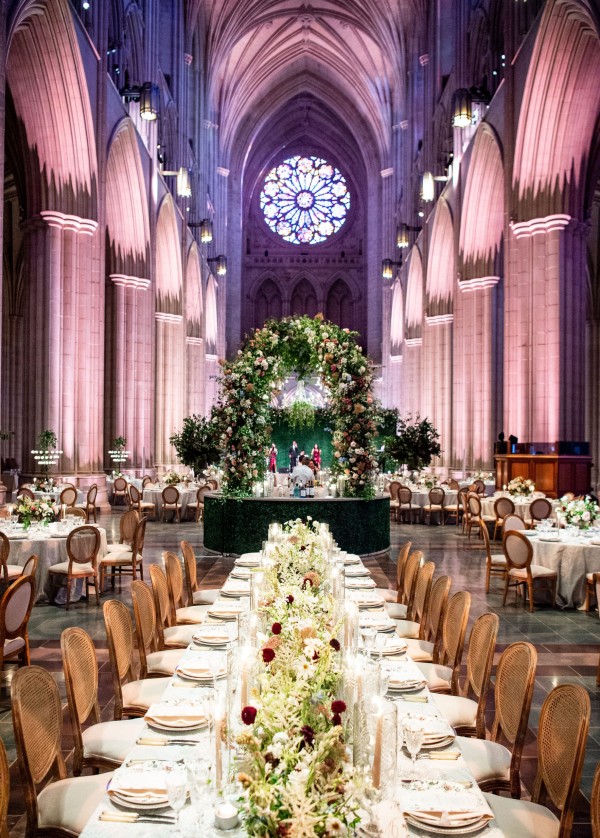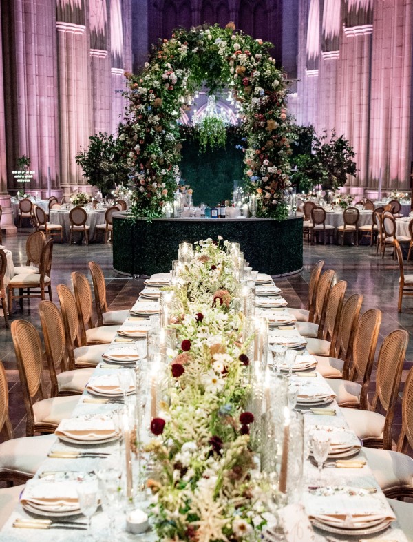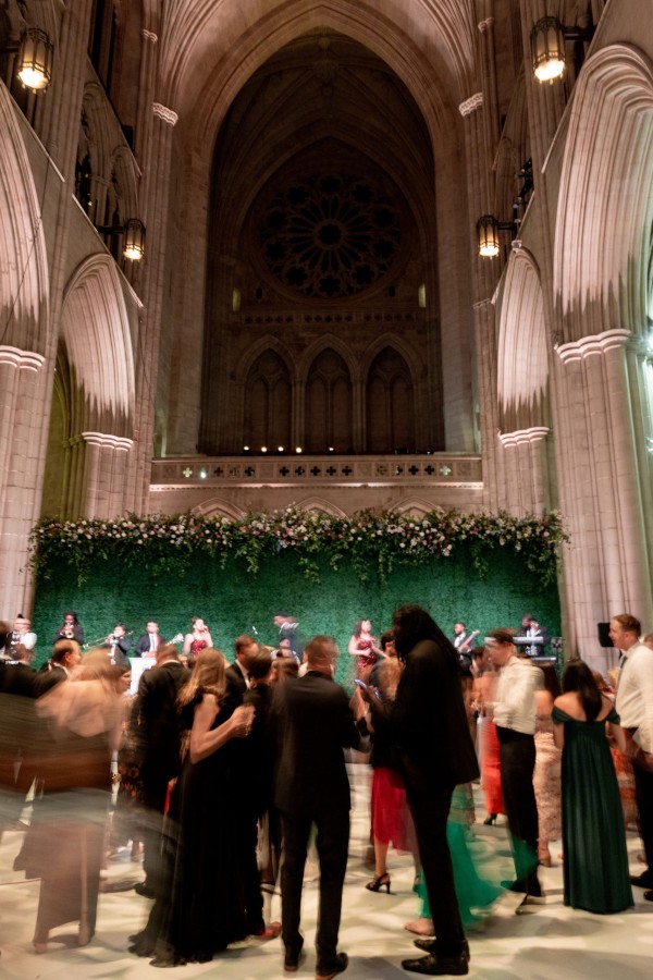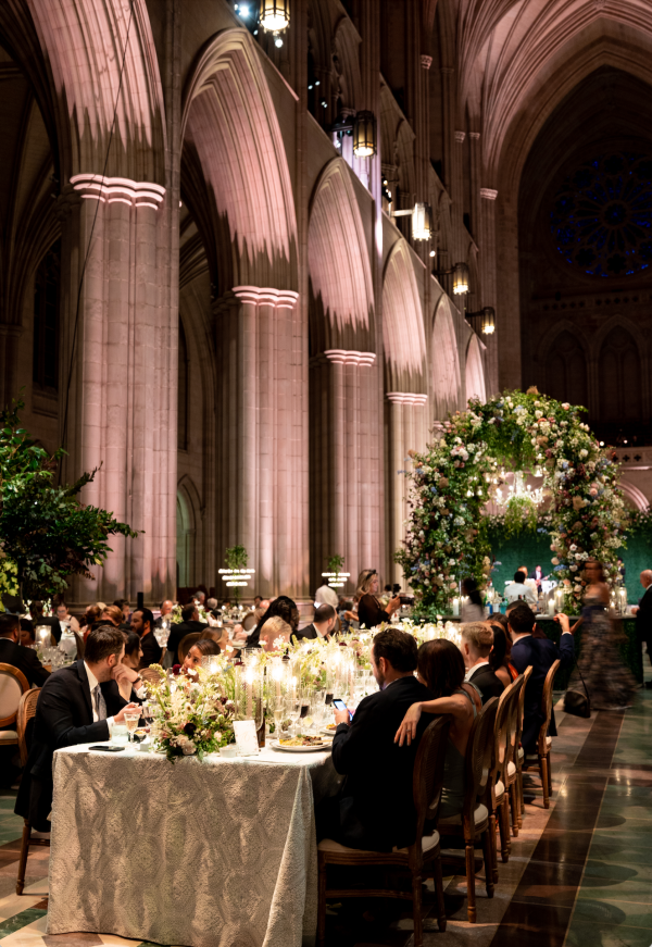 We designed an enchanted late summer evening at the iconic Washington National Cathedral for Mary and Paul. We drew inspiration from imagining a moonlit garden setting combined with the awe-inspiring gothic architecture of the Cathedral itself (the design of the Cathedral in the early 1900’s was heavily based on Notre Dame in Paris.). The mass took place in the Great Choir with cocktails following in the courtyard. Guests then entered the dinner and dancing reception in the Great Hall of the Cathedral, which was totally transformed for this event from how it typically looks for a Sunday Service. The client’s main request for the reception? A seated dinner but with a very fun party vibe! A large central boxwood and floral garden bar with thousands of blooms anchored the massive space and served as a central hub for the evening. Guests danced the night away to one of our favorite New York dance bands — or at least until it was time to head to the after party.