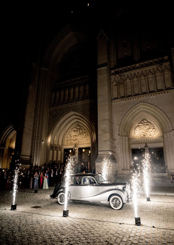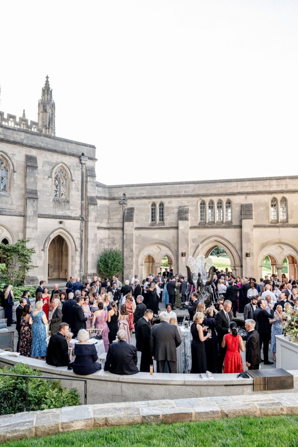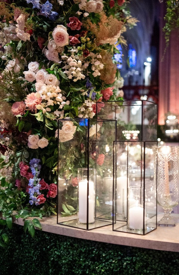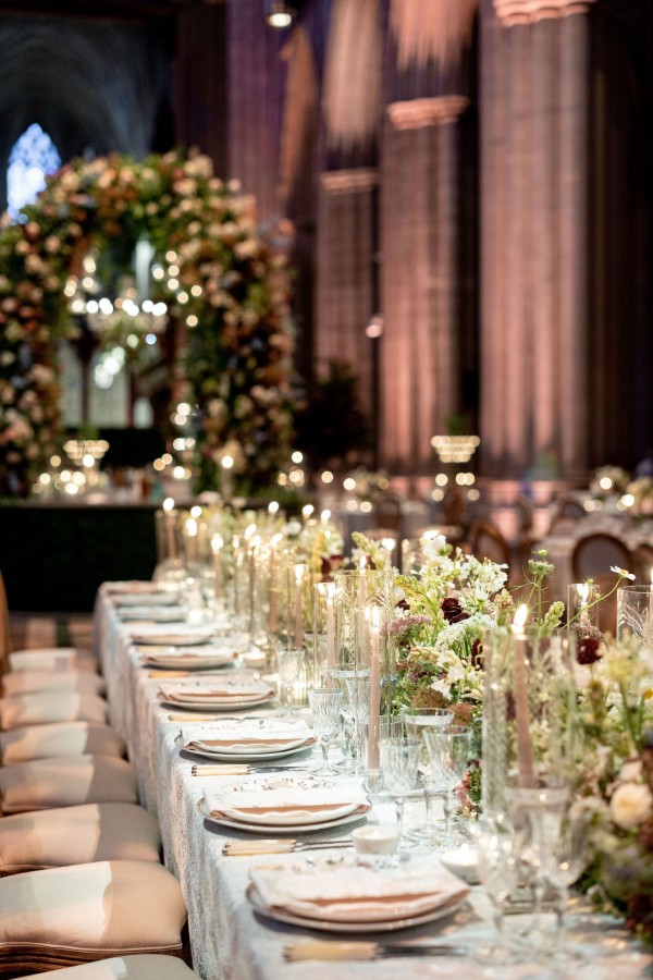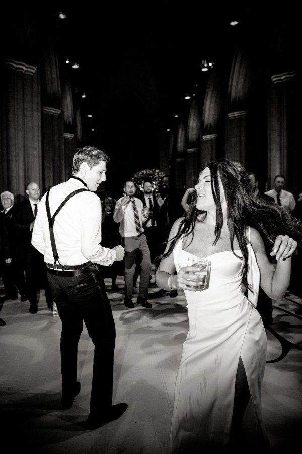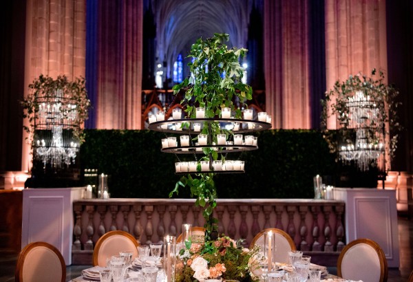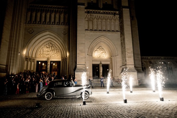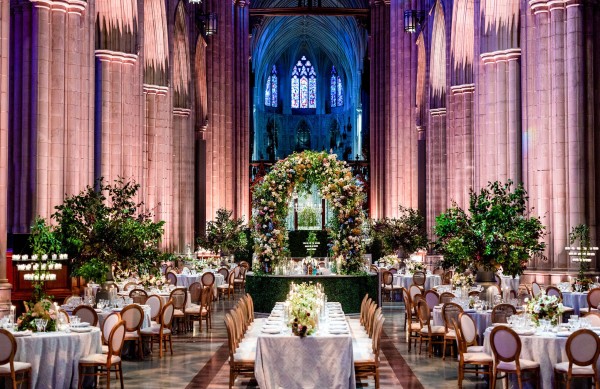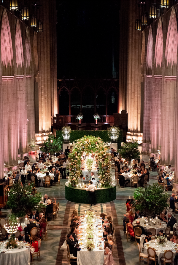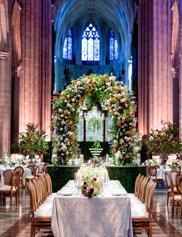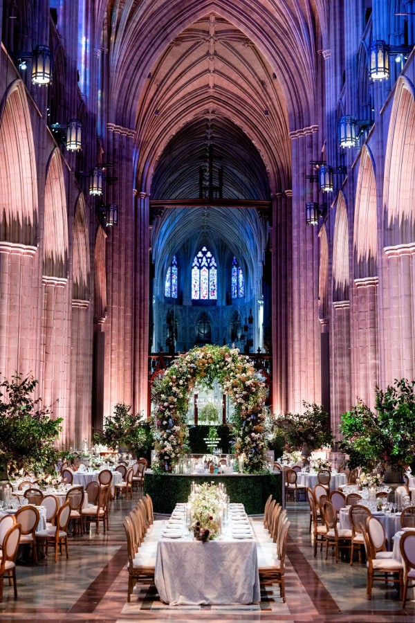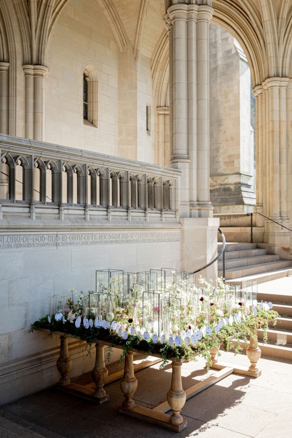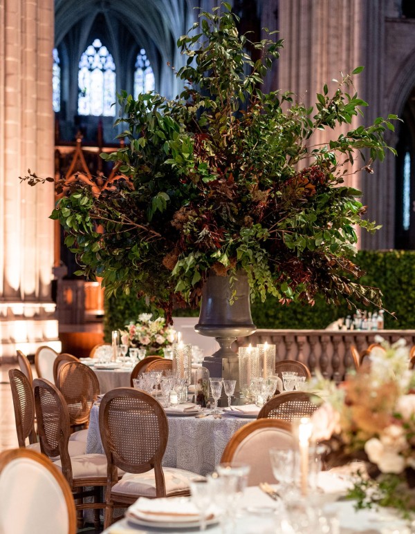 We designed an enchanted late summer evening at the iconic Washington National Cathedral for Mary and Paul. We drew inspiration from imagining a moonlit garden setting combined with the awe-inspiring gothic architecture of the Cathedral itself (the design of the Cathedral in the early 1900’s was heavily based on Notre Dame in Paris.). The mass took place in the Great Choir with cocktails following in the courtyard. Guests then entered the dinner and dancing reception in the Great Hall of the Cathedral, which was totally transformed for this event from how it typically looks for a Sunday Service. The client’s main request for the reception? A seated dinner but with a very fun party vibe! A large central boxwood and floral garden bar with thousands of blooms anchored the massive space and served as a central hub for the evening. Guests danced the night away to one of our favorite New York dance bands — or at least until it was time to head to the after party.