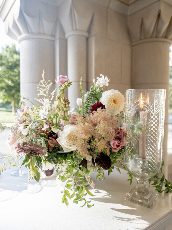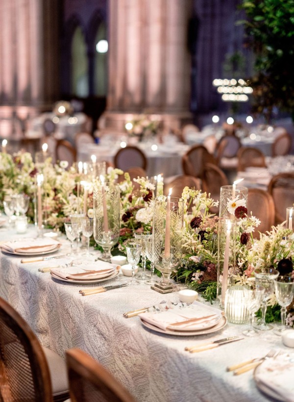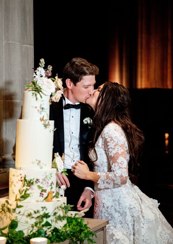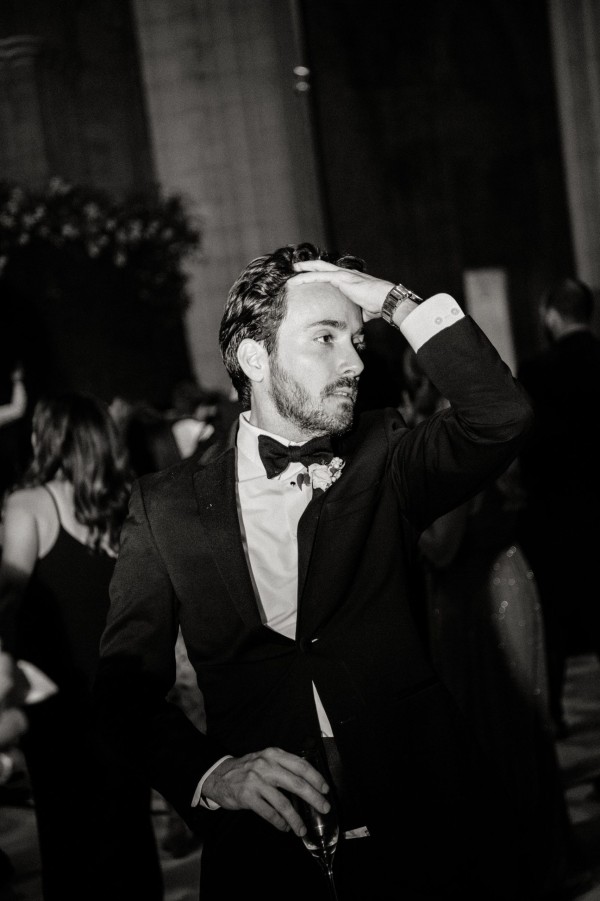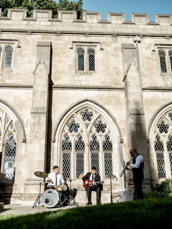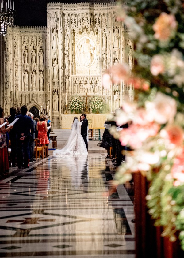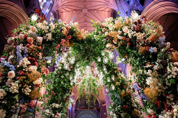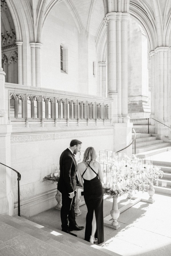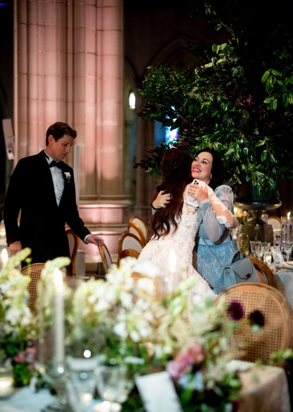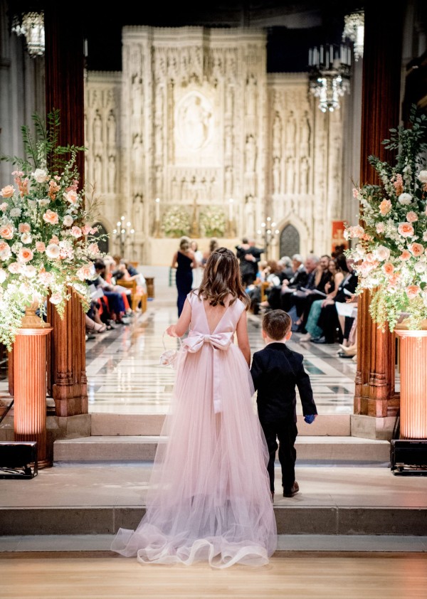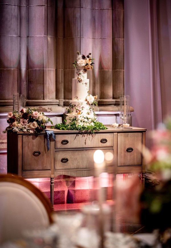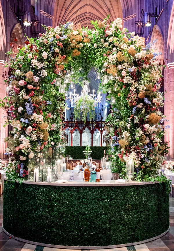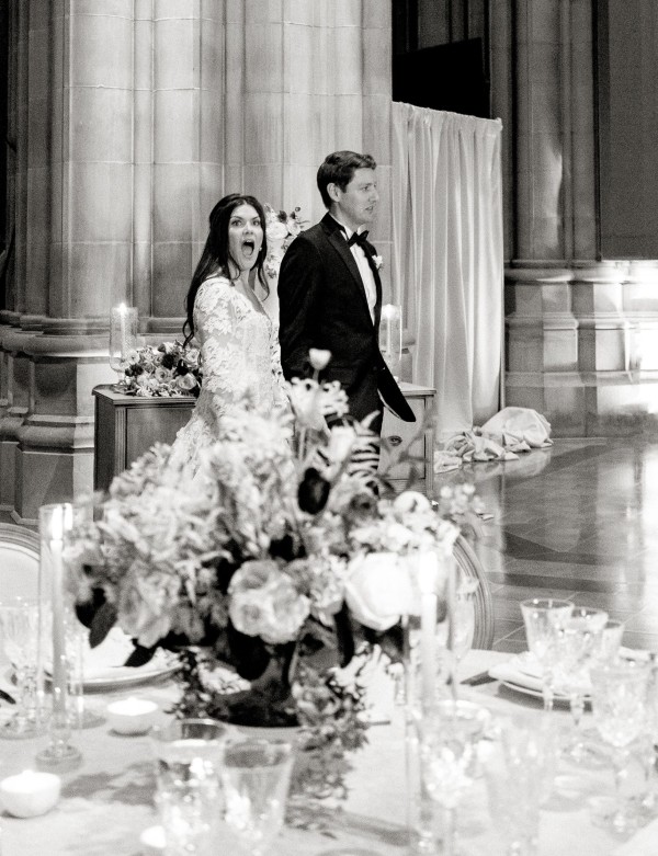 We designed an enchanted late summer evening at the iconic Washington National Cathedral for Mary and Paul. We drew inspiration from imagining a moonlit garden setting combined with the awe-inspiring gothic architecture of the Cathedral itself (the design of the Cathedral in the early 1900’s was heavily based on Notre Dame in Paris.). The mass took place in the Great Choir with cocktails following in the courtyard. Guests then entered the dinner and dancing reception in the Great Hall of the Cathedral, which was totally transformed for this event from how it typically looks for a Sunday Service. The client’s main request for the reception? A seated dinner but with a very fun party vibe! A large central boxwood and floral garden bar with thousands of blooms anchored the massive space and served as a central hub for the evening. Guests danced the night away to one of our favorite New York dance bands — or at least until it was time to head to the after party.